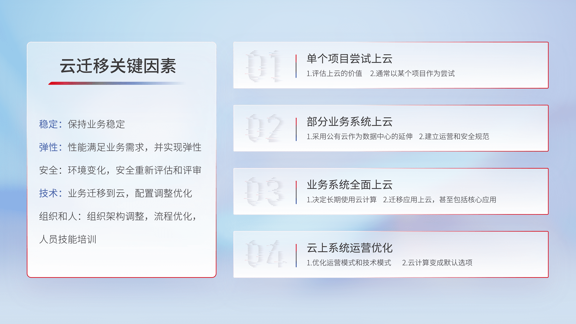 结合实际业务,,,,从规划设计、、、、云平台选型、、、、云原生改造、、数据迁移、、集成交付,,,迁移全过程为客户识别最佳上云路径,,,,做好风险识别管理,,,,设计网络架构、、、身份权限、、安全审计合规、、、操作审计、、日志审计、、监控告警策略、、多站点容灾设计等,,,对云上基础设施进行整体规划,,提升IT治理水平,,以满足弹性、、、、高可用、、高性能的需求。。