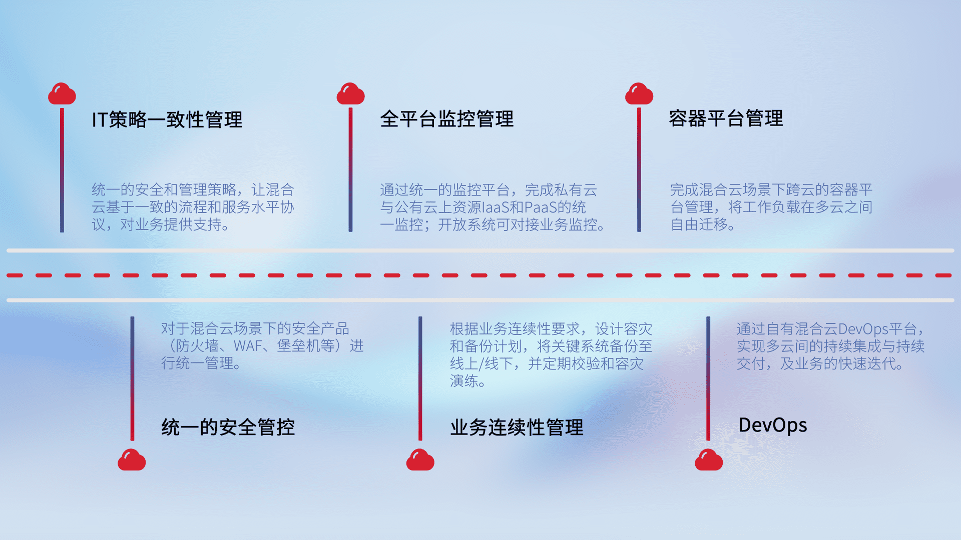 通过多云纳管,,,,以统一的资源数据模型把客户的云资源进行抽象和封装,,,进而实现对多云资源的统一操作,,保障云资源管理的可靠性、、、、稳定性与可用性。。量身定制化运维内容,,配置、、开发运维、、、补丁管理、、、备份、、监控、、认证和访问管理、、、、审计和日常巡检等,,保障在用云过程中的可靠度,,,,稳定度以及高可用率。。
