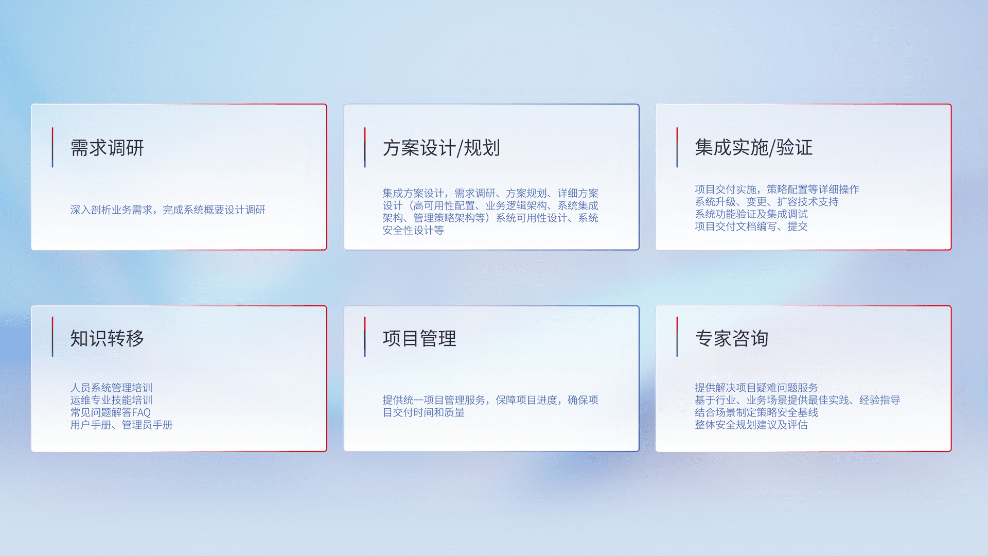 针对客户行业特性,,,,将宏观的安全战略和需求,,通过专业的交付服务,,,实现项目落地,,为客户提供标准规范的集成交付服务。。