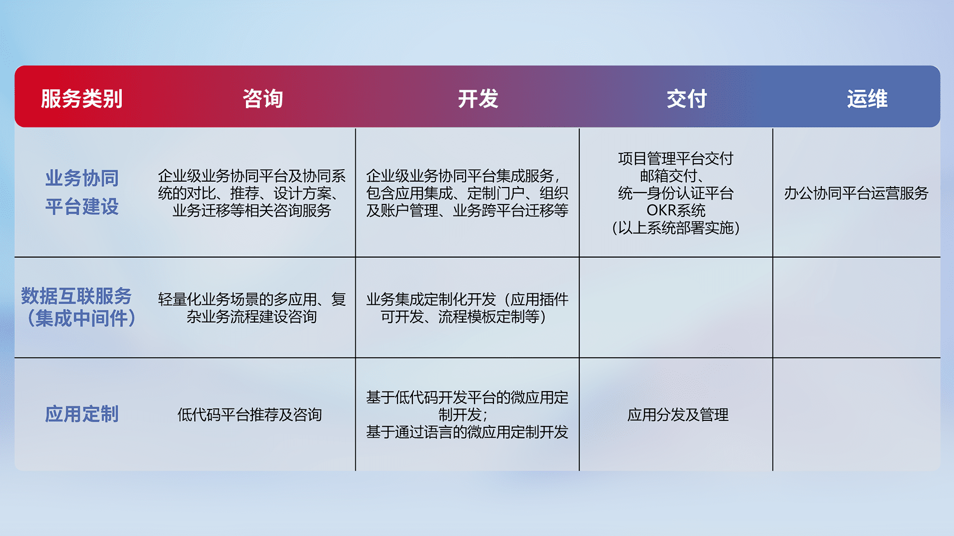 针对钉钉、、、、企微、、、IDaas等平台级产品提供产品的规划、、、方案、、、交付、、定制化开发等服务,,实现如统一协同办公、、智能客户服务、、、混合会议管理、、、智能数据查询、、、、等业务场景,,,实现数字化转型。。。